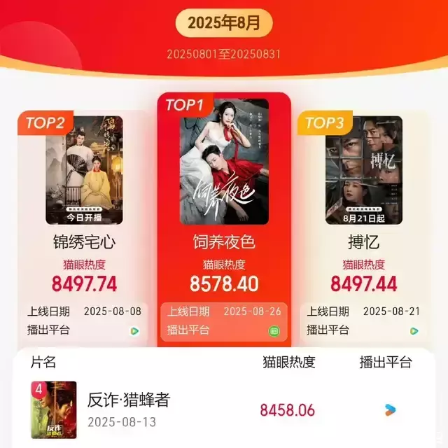 由霍建华、黄宗泽强强联合,主演的短剧《搏忆》收官了。八月份短剧热播排行榜上热度仅仅排到第三,距离还比它迟将近一个星期播出的不知名演员出演的土味短剧《饲养夜色》,还有一定差距。