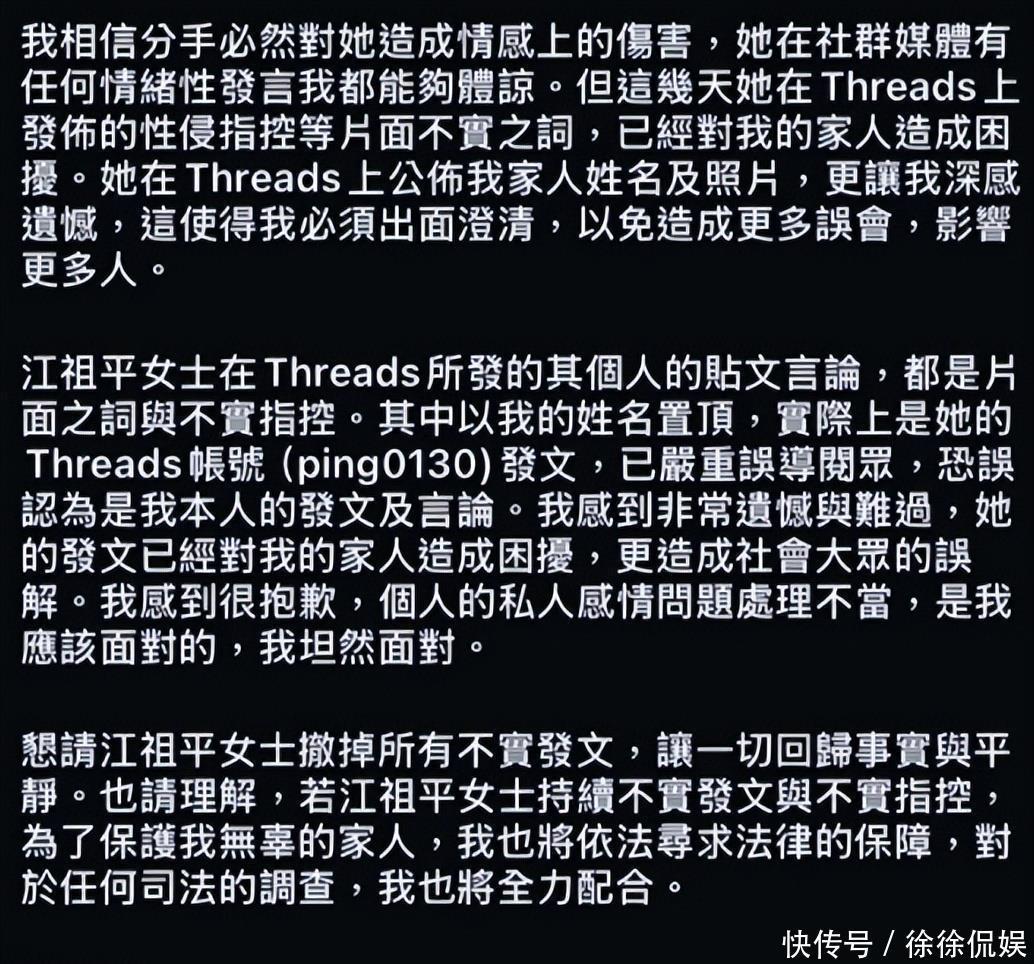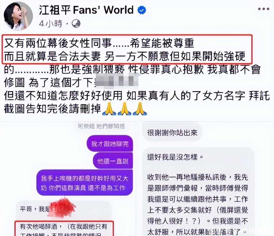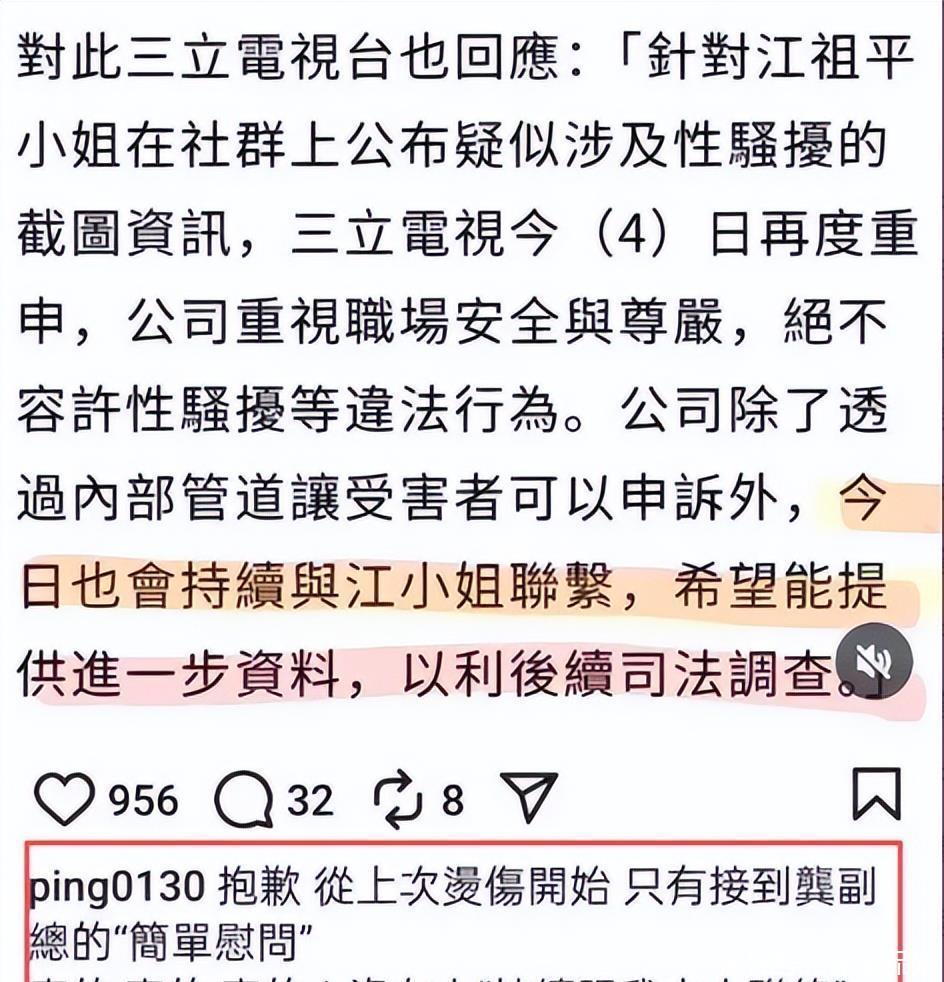 这两天,台娱最热闹的瓜,不是谁家离婚,而是“童年女神”江祖平亲手把前男友送上热搜,顺带把自己也挂在了上面。事情得从上周说起。江祖平突然在脸书替“电视台女同事”抱不平,说某高层公子借职务之便,给姑娘下药、性侵、拍裸照,一条龙犯罪。网友顺藤摸瓜,发现她口中的“公子”正是三立集团副总龚美富的独子——25岁的龚益霆。眼看火要烧到自己,龚益霆连夜开直播,话术很渣男:“我跟江祖平交往十个月,8月刚分手,她这是因爱生恨。”还顺手甩锅:“她情绪不稳,吵架时会自残,我提分手她才发疯。”一时间,风向有点歪:女神是不是拿“Metoo”当分手复仇工具?江祖平没废话,直接甩出王炸——9日凌晨,她发长文:“没有所谓女同事,受害者就是我自己。”
