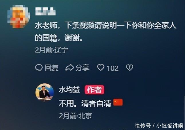 对于这个消息,网上的描述有鼻子有眼,甚至给出了他们一家在国外生活的细节。水均益澄清过,但是网友不信,这质疑一直到了他开通自己的抖音账号依旧存在,在他发的第一条视频下面,就是网友的质问:“水均益,下条视频请说明一下你和你全家人的国籍,谢谢”