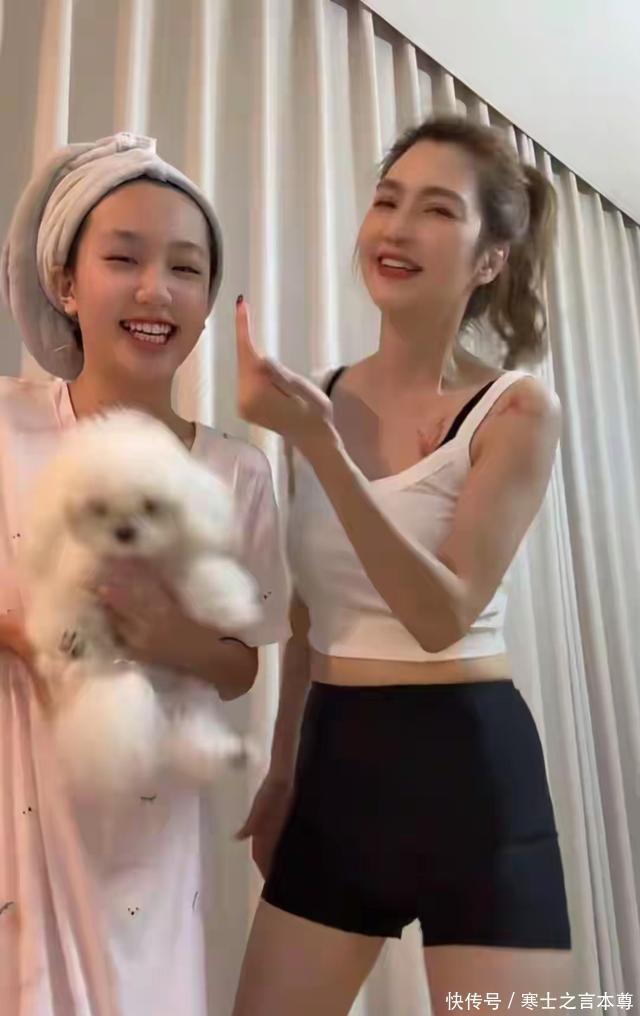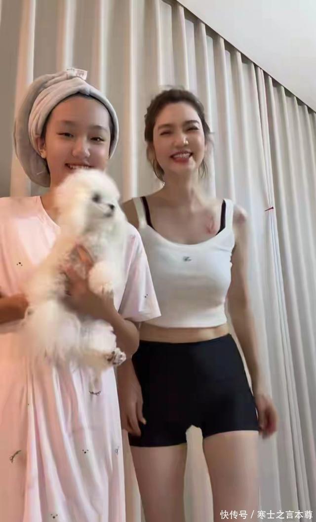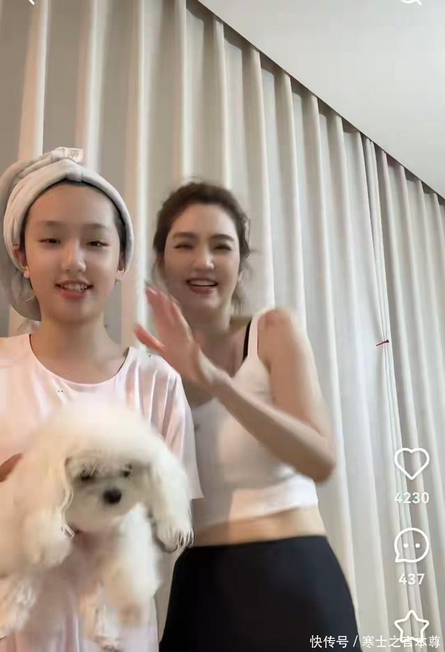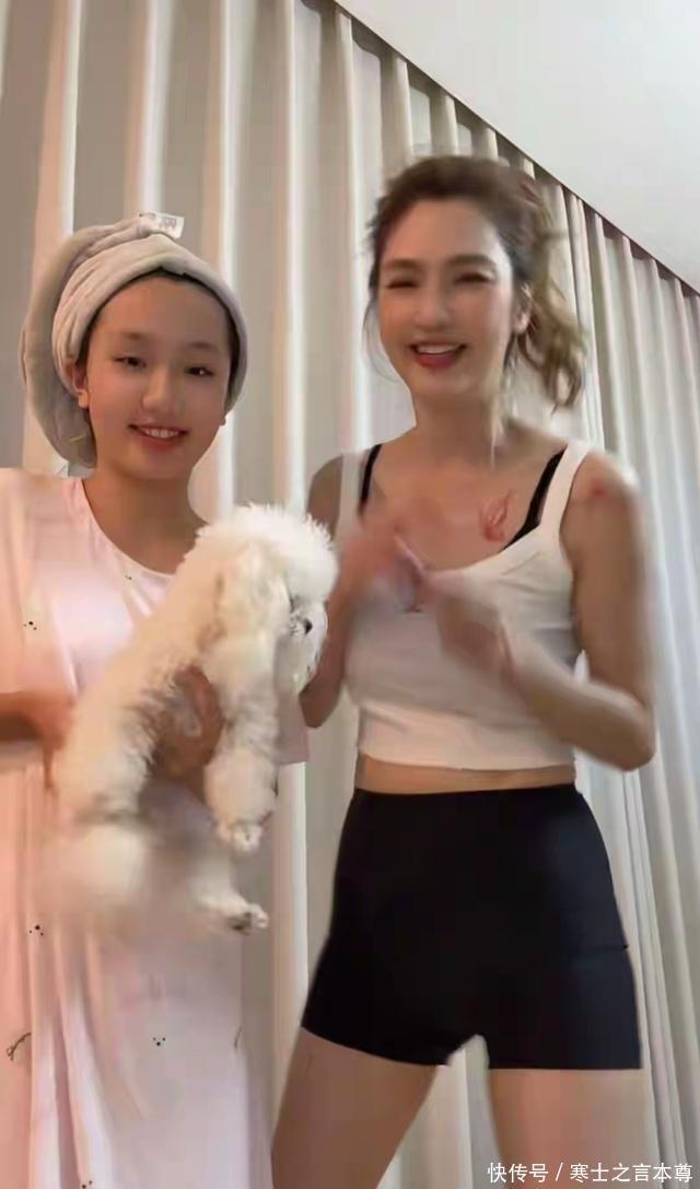 更有意思的是,洪欣跳舞的时候,还把刚洗完澡的女儿给拉出镜了,小姑娘穿着粉色的睡衣,头上包着毛巾,怀里还抱着一只可爱的小白狗,显然是刚结束惬意的沐浴时光,就被妈妈“拖”来入镜了。