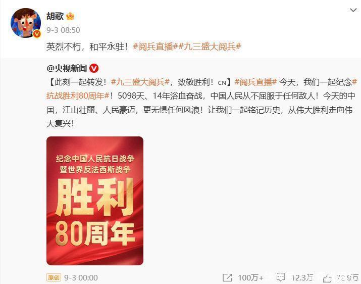 在9月3日,胡歌转发了央视新闻发的阅兵仪式文章,他用了“英烈不朽,和平永驻”这短短的八个字来进行怀念。虽然说这八个字的分量很重,但还是不足以让观众买账。毕竟,这次表态和他两天后长文悼念的“阿玛尼”去世有着极其明显的“文字差距”。
