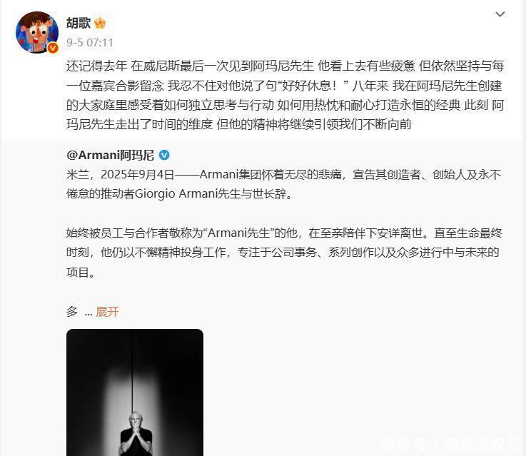 9月5日,胡歌在个人社交账号上转发了一则关于奢侈品总裁阿玛尼先生去世的帖子,并写了一段自己和对方的往事。他表示自己最后一次见到对方的时候,对方十分的疲惫,但还是会和嘉宾合影。