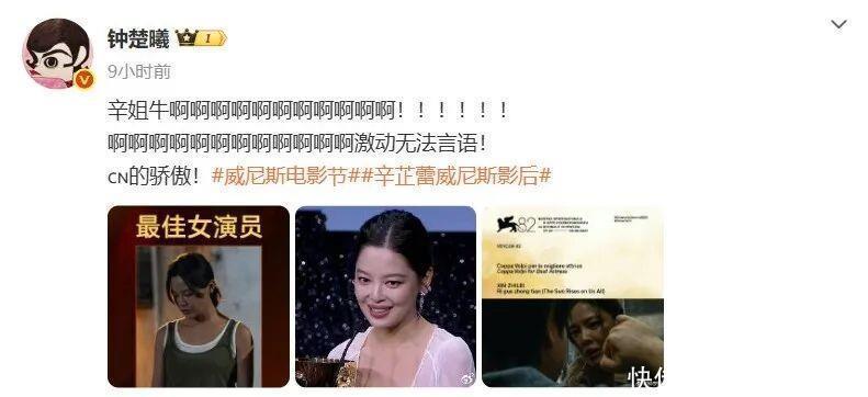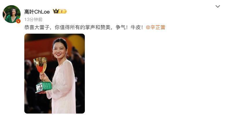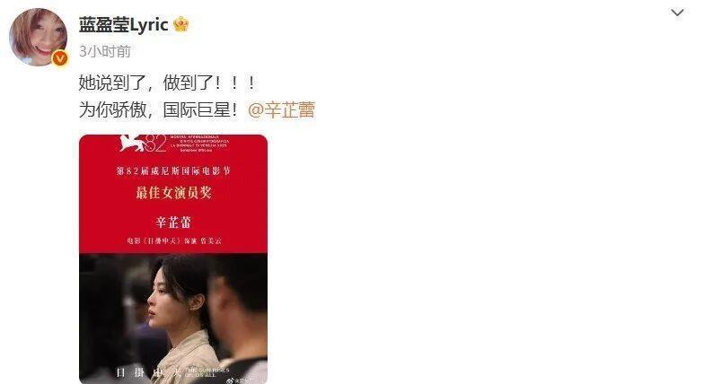 在辛芷蕾获威尼斯影后的消息传来后,已有众多艺人发文祝贺辛芷蕾,蓝盈莹发文称:“她说到了,做到了!!!为你骄傲,国际巨星!”